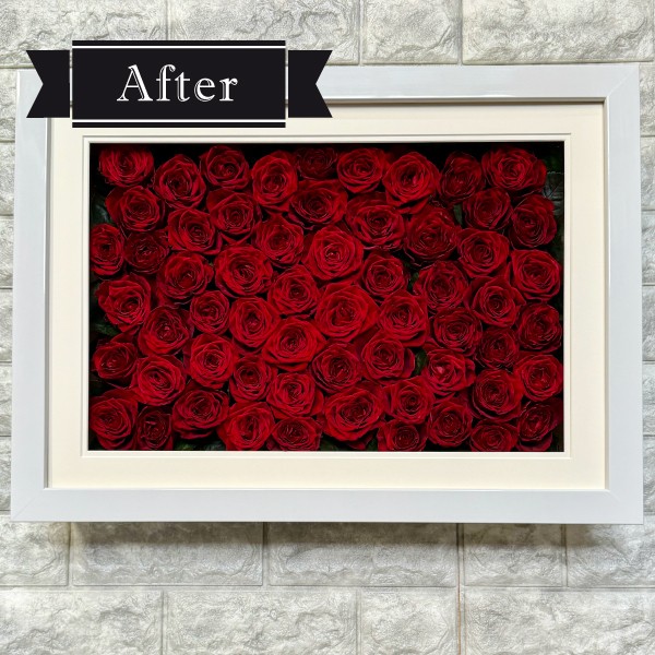 使用された生花の色や形に限りなく近い形で仕上げますが、必ずしも同じになりません。花や葉に傷みのあるものは傷として残る可能性があります。痛みの程度によって花が使用できないことや、一部同様の新しい花を使用する場合があります。加工に不向きな花材はご相談させていただく場合があります。 その他注意点は「よくあるご質問」へ。