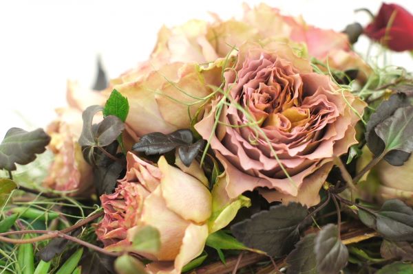 - バラ(テナチュール)・・・ブーケに人気のテナチュールは紅茶のような味わい深いシックな色としっかりとした花姿が大人の雰囲気を醸し出す。