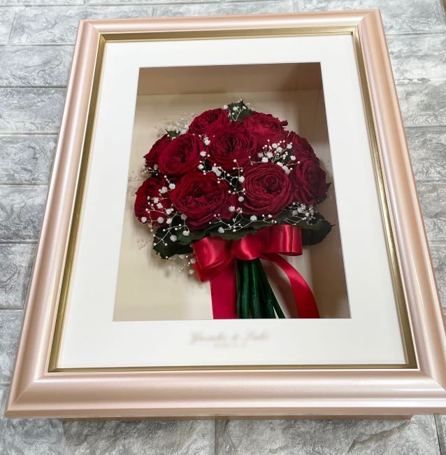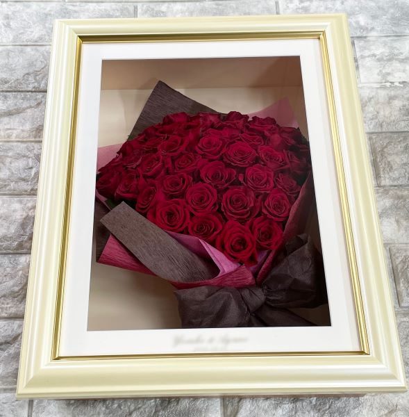 こちらは、プロポーズでプレゼントされた真紅のバラの中から、お好みのオーダーメイドプリザーブドフラワー「Carre(カレ)」のデザインに、出来るだけたくさんのお花をラウンドデザインに詰め込んだ作品になります。バラの大きさでお入れする本数も変わりますが、今回は33本のバラの花が作品の中に入りました。33本のバラの花の持つ意味は「生まれ変わっても愛する」。プロポーズの大切な気持ちがそのまま作品になりました。