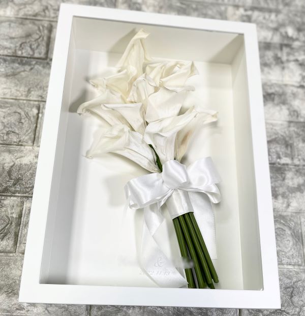 今回は、白いウェディングブーケをプリザーブド加工したCoffret(コフレ)の2つの作品を、