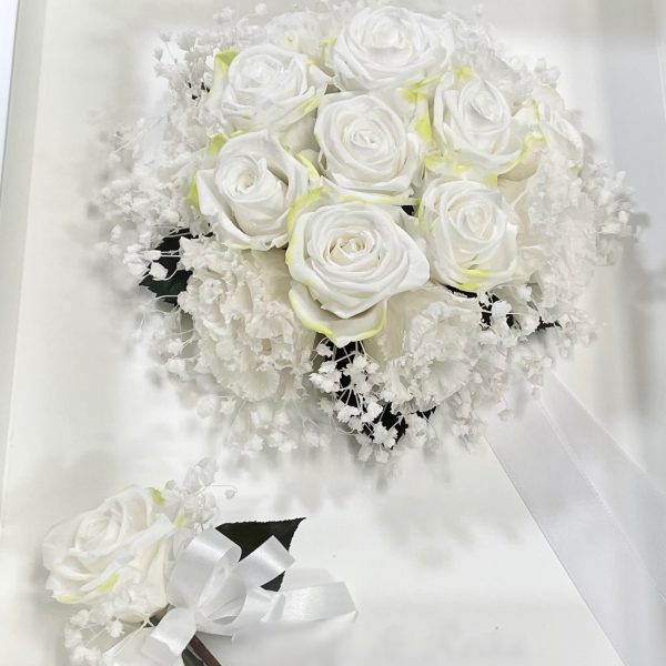 ※ブーケの定番・白いバラとトルコキキョウとカスミソウ~おそろいのブートニアが寄り添ったオーダーメイドプリザーブドフラワー「Coffret」の作品