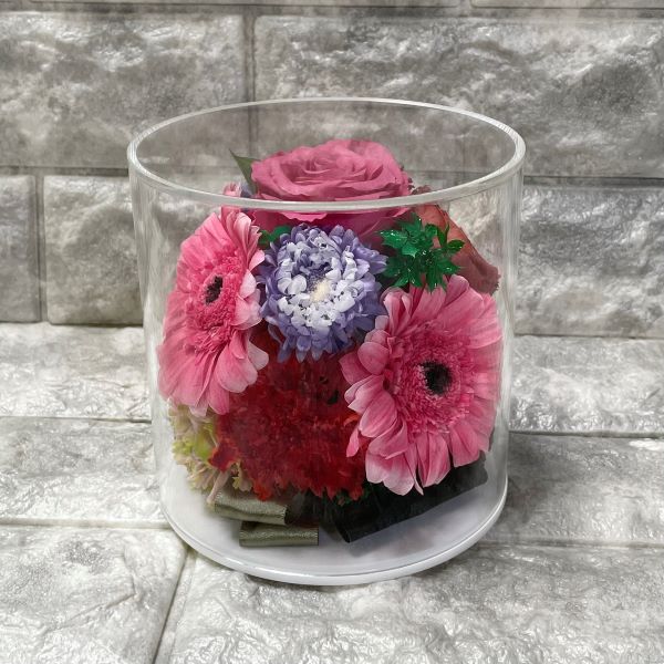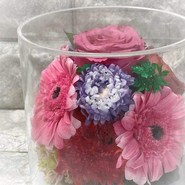 - 商品ラインナップ「Colonne」(コロン)を使用したオーダーメイドプリザーブドフラワーの作品例・・・想いの詰まった花束を残されたいとオーダーいただいた、オーダーメイドプリザーブドフラワー「Colonne」(コロン)の作品をご紹介。鮮やかなピンクのグラデーションカラーのガーベラがメインの花束を円筒形の中にアレンジしている。花びら1枚1枚に丁寧に色付けしたグラデーションカラーのガーベラをはじめ、たくさんの種類の花束の花が円筒いっぱいに詰め込まれている。いろいろな色のお花が明るく鮮やかに良き日の想い出を想い出させてくれるような作品に仕上がっている。