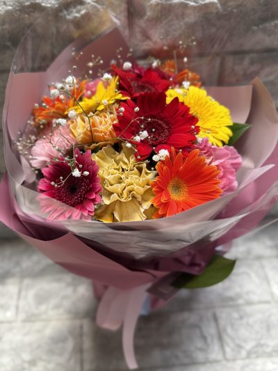 ※ガーベラ・カーネーション・カスミソウのカラフルなお花が・・・