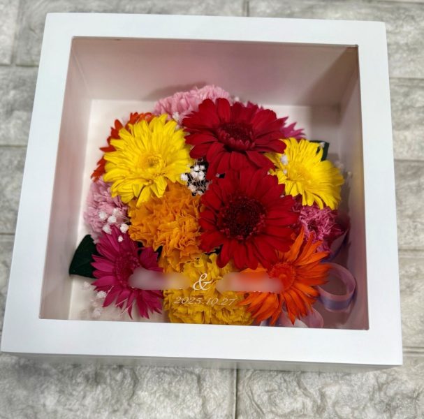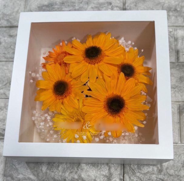 今回は、神奈川県にお住まいのお客様からオーダーいただいた、ひとつはひまわり・ガーベラ・カスミソウのお花、もうひとつはガーベラやカーネーションなどカラフルなお花の、2つの大切なお花をそれぞれ記念の作品に保存したオーダーメイドプリザーブドフラワーの作品を紹介しました。