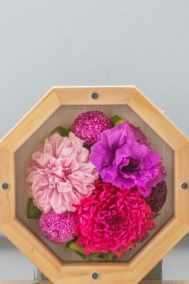 人生の節目のお祝いとそのシーンでプレゼントされるお花やその色などについて触れましたが、いつの日もお祝いのシーンというものは嬉しいものです。楽しい気持ちや嬉しい気持ち・お祝いしていただいた方への感謝の気持ち・・・人生の節目のプレゼントのお花をたった一つの記念の想い出としてオーダーメイドプリザーブドフラワーの作品として残してはいかがでしょうか。Fue Flowerでは、縁起が良くお祝いのお花を残す作品として喜ばれる八角形の形をした商品ラインナップ「Mignon(ミニョン)」や「Mimi(ミミ)」を取り扱っております。プリザーブドフラワーの生花のようなみずみずしさと豊富でカラフルなカラー展開が、人生の歩みに華やかな想い出の彩りを添えてくれることと思います。