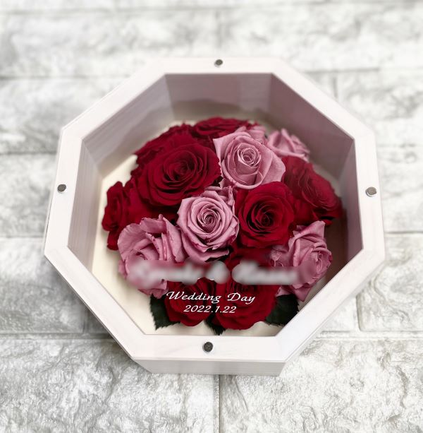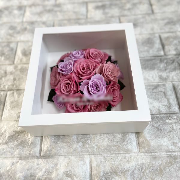 ※ピンクとパープルの色合いがエレガントな装いの、オーダーメイドプリザーブドフラワー「Petit Carre」の作品