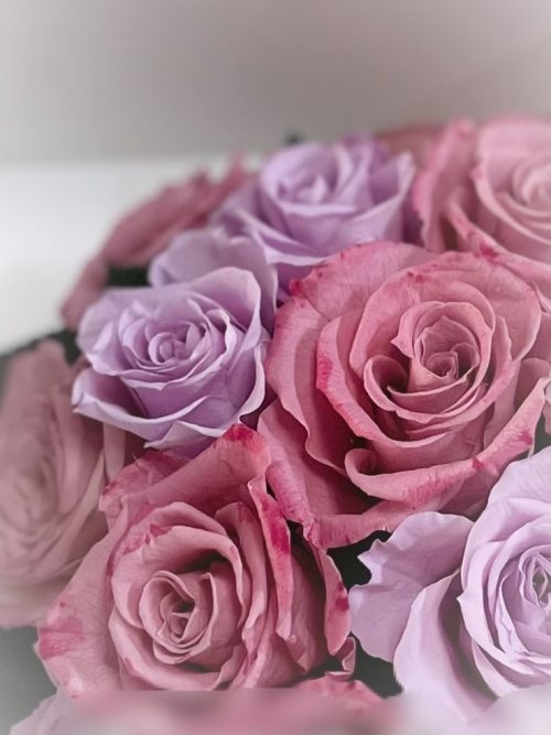 こちらは、ハロウィンピンクと淡いパープルのバラをボリューム感たっぷりに保存したオーダーメイドプリザーブドフラワー「Petit Carre(プチカレ)」の作品です。ニュアンスのあるピンクやパープルカラーがとってもエレガント。ハロウィンにはグラデーション加工を施し、生花の雰囲気を感じる作品になっています。