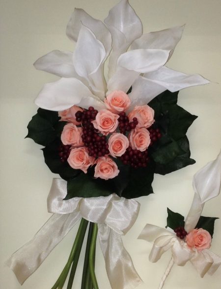 カラーも結婚式で人気のお花です。いろいろな色のカラーがありますが、結婚式ではやはり白色のカラーが人気でしょうか。茎の部分をリボンで束ねたカラーのアームブーケは、すっきりとしてシンプルながらもエレガントな花姿です。