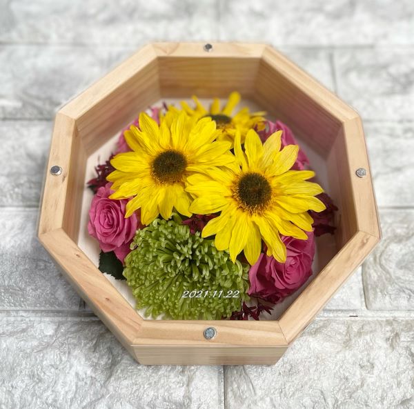 大切な花束の「ダリア」をはじめ、そのほかのお花も一緒に残したい、大切なお花をできるだけたくさん記念に残したい。という想いを叶えることが出来るのが、八角形をしたミディアムサイズの商品ラインナップ「Mignon(ミニョン)」。ダリアやユリなどのサイズが大きくて豪華に咲く形をしたお花も、Mignon(ミニョン) ならそのほかのお花と一緒に残すことが出来る。八角形のフレームの中で大切なお花が寄り添うようにデザインされ、想い出が詰まった宝箱のような作品として残していただくことが出来る。