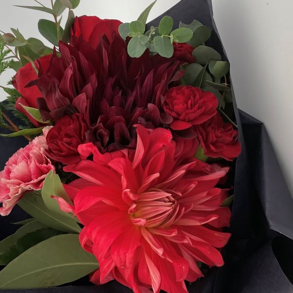 こちらは、赤色の濃淡があるダリアが2輪入ったオーダーメイドプリザーブドフラワー「Mignon(ミニョン)」の作品になります。明るめの赤と真紅のダリア・2色のカーネーション・真紅のバラがグリーンとともに作品の中に入っています。咲き方も豪華な10cmほどのサイズの赤色のダリアが作品の中でより一層華やかさを醸し出しています。情熱的な赤やピンクの花の色も、華やかさに色を添えています。