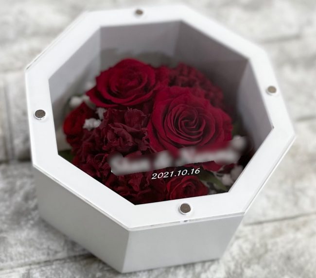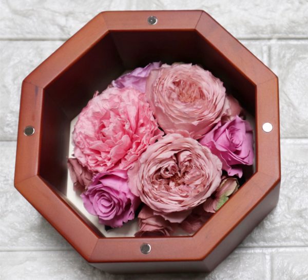 縦横15~16cmほどのコンパクトサイズの八角形ボックス「Mimi」。大切な花束を少しでも残したい・・・との想いを持つ人にぴったりのサイズ感です。壁掛け・置き物のどちらでも使用することが出来、お部屋のインテリアの一部としてさりげなく飾っていただける商品ラインナップです。