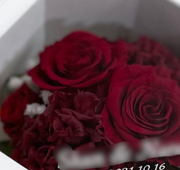 こちらは、大切な花束を少しでも残したいと希望されて制作したオーダーメイドプリザーブドフラワー「Mimi」の作品になります。真紅のバラとカーネーションに白いかすみ草がアクセントになっています。真紅のバラ・カーネーション・かすみ草の花束から数輪をチョイスして、コンパクトなサイズの中にも華やかさを表現しました。真紅のバラやカーネーションの花言葉「情熱的な愛情や大好き」の想いと、白いかすみ草の花言葉「感謝」の想いがたくさんこもった花束を、コンパクトにかわいく、さりげなく仕上げています。