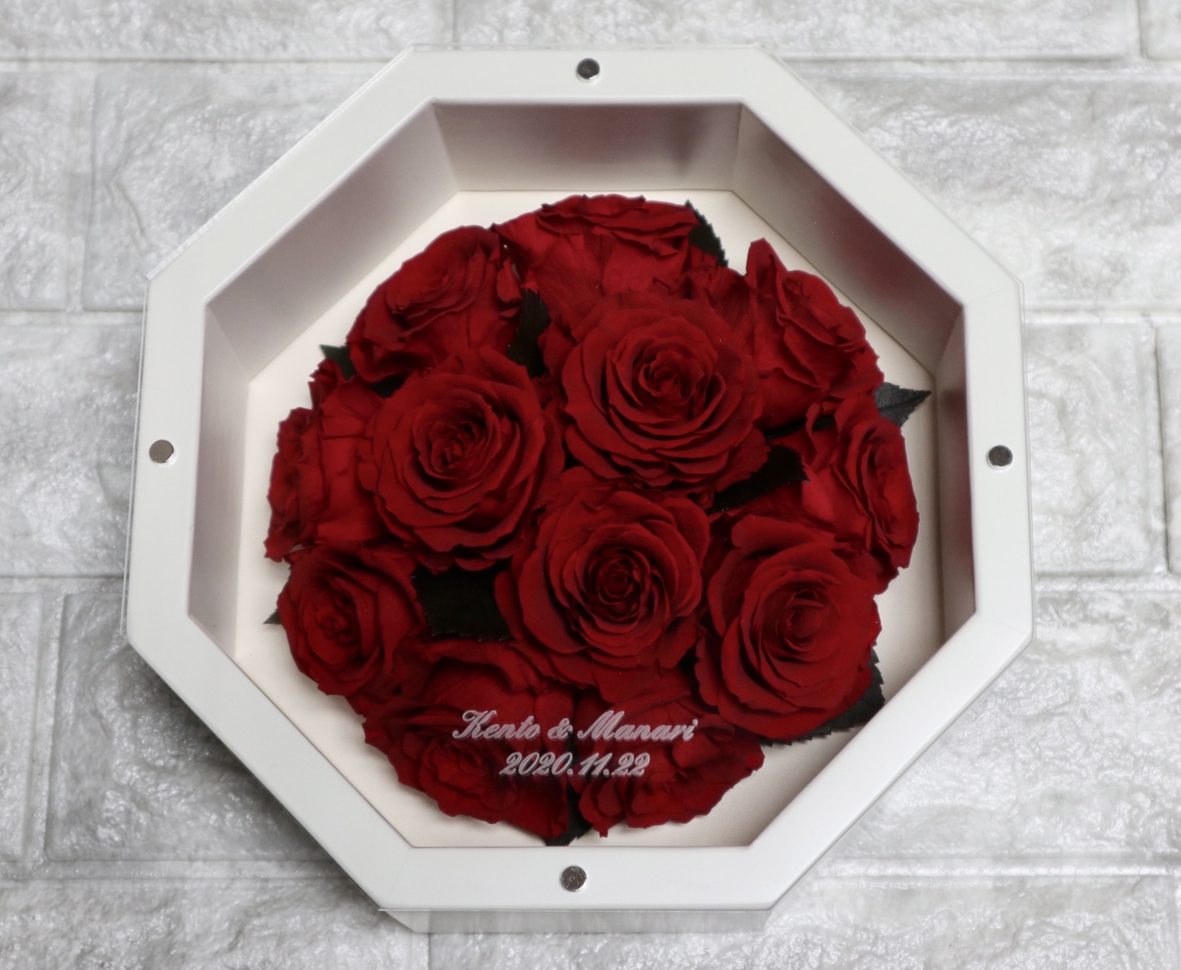 こちらの画像は、プロポーズの12本のバラの花束をMignonのボックスにアレンジしたものです。こちらのボックスには、花径5cmほどのバラ12輪が入っています。以前のブログ~【バラの本数と花言葉の秘密】プロポーズの大切な想いをいつまでも~でも触れましたが、12本のバラは<ダーズンローズ>と呼ばれ、プロポーズで送る花束としてとても人気があり、その花を記念に永く残したい方がとても多くみられます。プロポーズの幸せな気持ちが未来へと末永く広がってゆくような想いのこもった作品となっています。