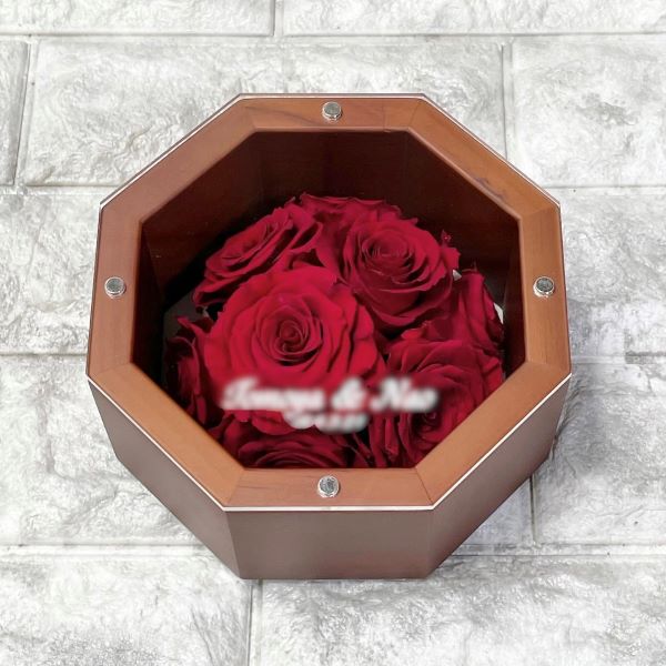 落ち着いたブラウンタイプの八角形ボックス「Mimi(ミミ)」に、8本のバラの花が可愛らしく寄り添っています。