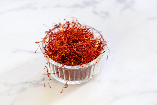 サフランが使用される料理にはパエリアやサフランライスなどがありますね。サフランはサフランの花の3分裂された赤い雌しべの部分がサフランとして使用され、この赤い部分の雌しべを水に浸すと黄色の成分(クロシン)が出て黄色く色付けされます。ひとつのサフランの花から採れる雌しべは3本だけなので、サフランはとても高価なスパイスです。そんなサフランはほんの少しの苦みと独特の香りがあり、この香りが魚介類と相性が良いのでシーフード料理に使用されることも多いです。