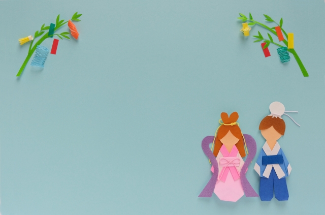 七夕は、古来中国の伝説が由来になります。昔、天帝(神様)には織女(織姫)という娘がいました。織姫は機織りの仕事が上手な働き者の女性でした。この頃、同じく牽牛(彦星)という牛の世話をしている働き者の男性がおりました。天帝が織姫に彦星を引き合わせたところ、二人はすぐに恋に落ち、結婚をしました。しかし、結婚してから二人は遊んでばかりで働かなくなってしまいました。そこで怒った天帝は、2人を天の川の両岸に引き離しました。離れ離れになってしまった二人は泣き、悲しみにくれました。そしてあまりにも悲しむ二人を見た天帝は、以前のように真面目に働くことで一年に一度、七夕の夜にだけ二人が会うことを許すようになりました。真面目に働くことを約束した二人は、一年に一度の出会いを心待ちにして一生懸命働くようになりました。