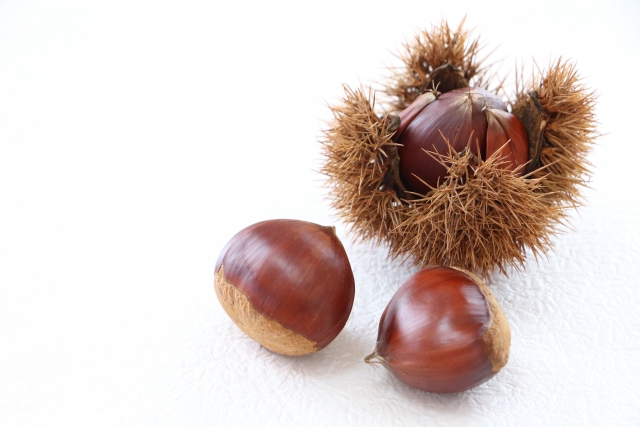 こちらも秋の味覚の定番食材・栗。焼き栗はもちろんのこと、栗ごはんや甘露煮、栗きんとんなど、ごはんからおかず・お菓子まで秋の味を堪能できる万能食材です。秋になると必ず栗が食べたくなる人は多いのではないでしょうか。栗もまたビタミンやカリウム・食物繊維など栄養価の高い健康食材です。柿同様に、健康効果や老化防止効果など様々な効能を与えてくれます。栗を見ると、艶やかで落ち着いた茶色のイメージが強いですよね。秋=茶 を栗から連想する人も多いのではないでしょうか。