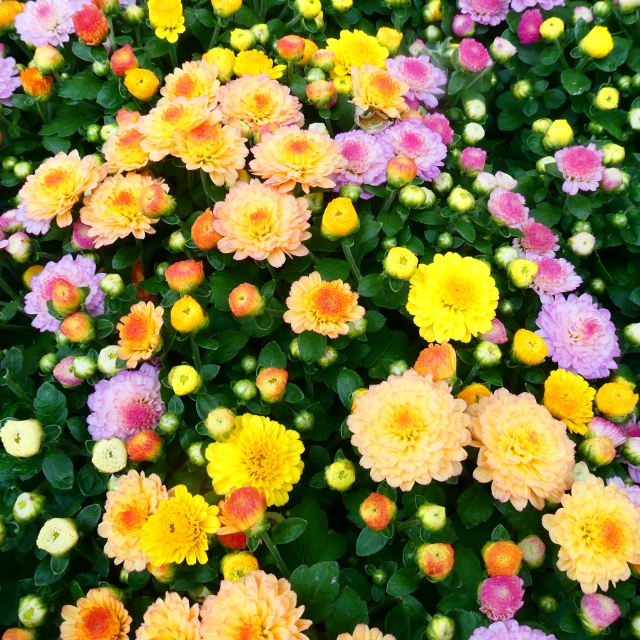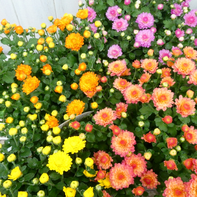 ポットマムは、鉢植え用に開発された洋菊の園芸品種です。秋の花壇をカラフルに彩るポットマムは、開花時期は9月~11月とちょうどこの時期に私たちの目を楽しませてくれます。ポットマムの色はとても多彩。秋の味覚を花色で感じることの出来るオレンジ・茶・赤をはじめ白・ピンク・黄・緑・複色などがあり、ガーデニングで色とりどりに咲く花姿は私達を明るい気持ちにさせてくれます。目で見て楽しんで・・・秋を感じる彩りをお花で感じることも、秋の楽しみのひとつですね。