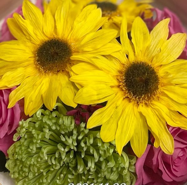 オーダーされる際に、大輪のひまわりとデコラタイプのアナスタシアグリーン菊を残したいとのご要望でMignon をお選びいただきました。
