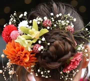 成人式では着物を着ることが多いですが、やはり和装の装いにはマムがよく似合います。成人式にいろいろな色のマムを髪飾りとしてチョイスする方は多いです。ほかの飾りとも調和しやすく、可愛くてパッと目を引くマムは、成人式の髪飾りの定番にもなっています。その他にも、着物や袴などを着る機会のある卒業式や七五三などの行事にも、マムのヘアアレンジは多く登場しています。