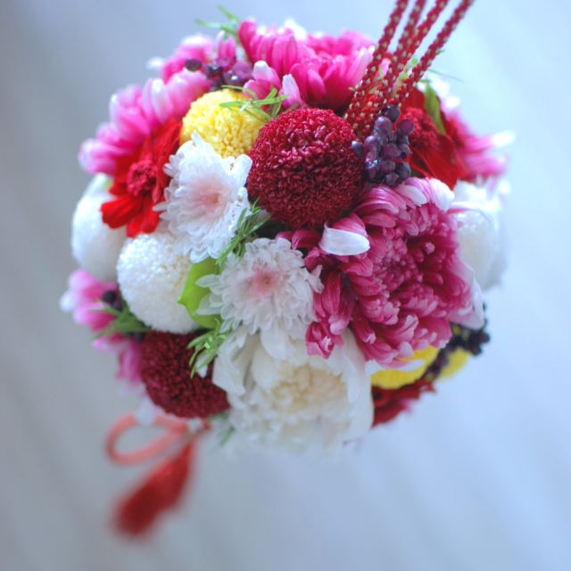 和装のピンポンマムと言えば、白無垢の「白」をイメージされるかもしれません。実際白のピンポンマムが使用されることは多いです。しかし、白だけでなく、緑や黄色・赤などいろいろな色のピンポンマムや、ピンポンマムとそのほかの花との組み合わせも多いです。また、和装の華やかな着物に合わせた色とりどりのピンポンマムや、色マムとお気に入りのお花のボールブーケで和ゴージャスな雰囲気を取り入れる方も多いです。