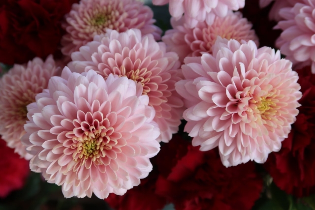 敬老の日は、9月の第3月曜日。まさに菊の花の開花シーズンです。人生の先輩、おじいちゃんおばあちゃんに、日頃の感謝の気持ちと長寿への願いを込めてお祝いのフラワーアレンジメントをプレゼントする人も多いと思います。プレゼントされた人が明るく優しい気持ちになるような明るいピンクや、元気で前向きな気持ちになるような黄・オレンジ・黄緑のビタミンカラーのマムを取り入れたアレンジメントはいかがでしょうか。決して主張しすぎないマムの形は、他のお花ととてもよく合います。敬老の日に人気のラン・ガーベラ・リンドウや、プレゼントの定番、バラの花などと一緒にアレンジするととっても素敵なアレンジメントになります。