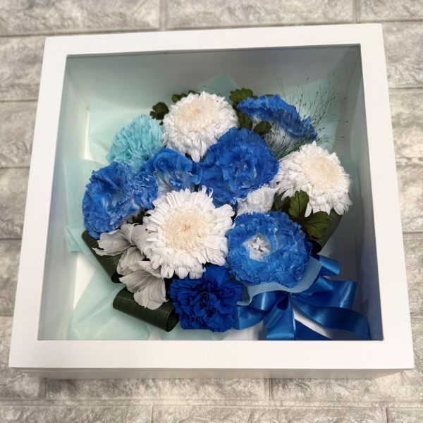 こちらは、埼玉県にお住まいのお客様からオーダーいただいたオーダーメイドプリザーブドフラワー「Carre(カレ・ブーケタイプ)」の作品です。ブーケをきゅっと丸く束ねたイメージで~。白・水色・青のお花がラウンドデザインで寄り添っています。青と白のトルコキキョウのグラデーションもいい感じ。ラウンドデザインで保存するなら、正方形のボックスがブーケのデザインによく合います。同系色のラッピングとリボンも素敵なアクセントの、クリアで涼し気なブーケの魅力が感じられる作品に仕上がっています。