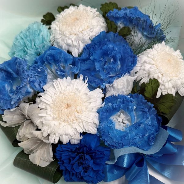 ※白と青(ブルー)のイメージとプリザーブドフラワーの作品については。ブログ【青×白は最強コントラスト!】爽やかカラーの2色をプリザーブドフラワー加工の作品に で触れております。気になる方は覗いてみてくださいませ。