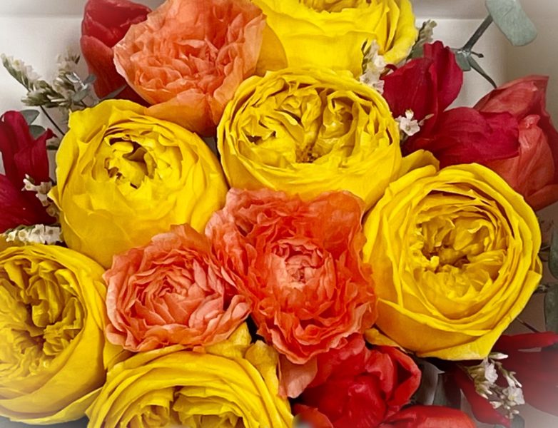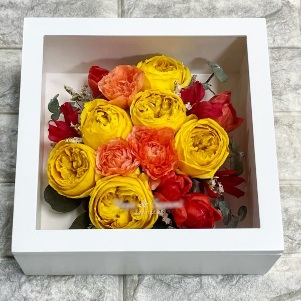 - 黄色とオレンジ・色鮮やかに残したオーダーメイドプリザーブドフラワーの作品例・・・想いの詰まった花束をプリザーブドフラワー加工し、正方形の白いボックス「Petit Carre(プチカレ)」で残したオーダーメイドプリザーブドフラワーの作品をご紹介。可愛い丸型フォルムの黄色いバラ・オレンジの春花ラナンキュラスラスやチューリップが色鮮やかな花束に、アクセントの赤色や白色のお花とグリーンも一緒に白いボックスにデザインしてカラフルなお花であふれた作品に仕上がっている。